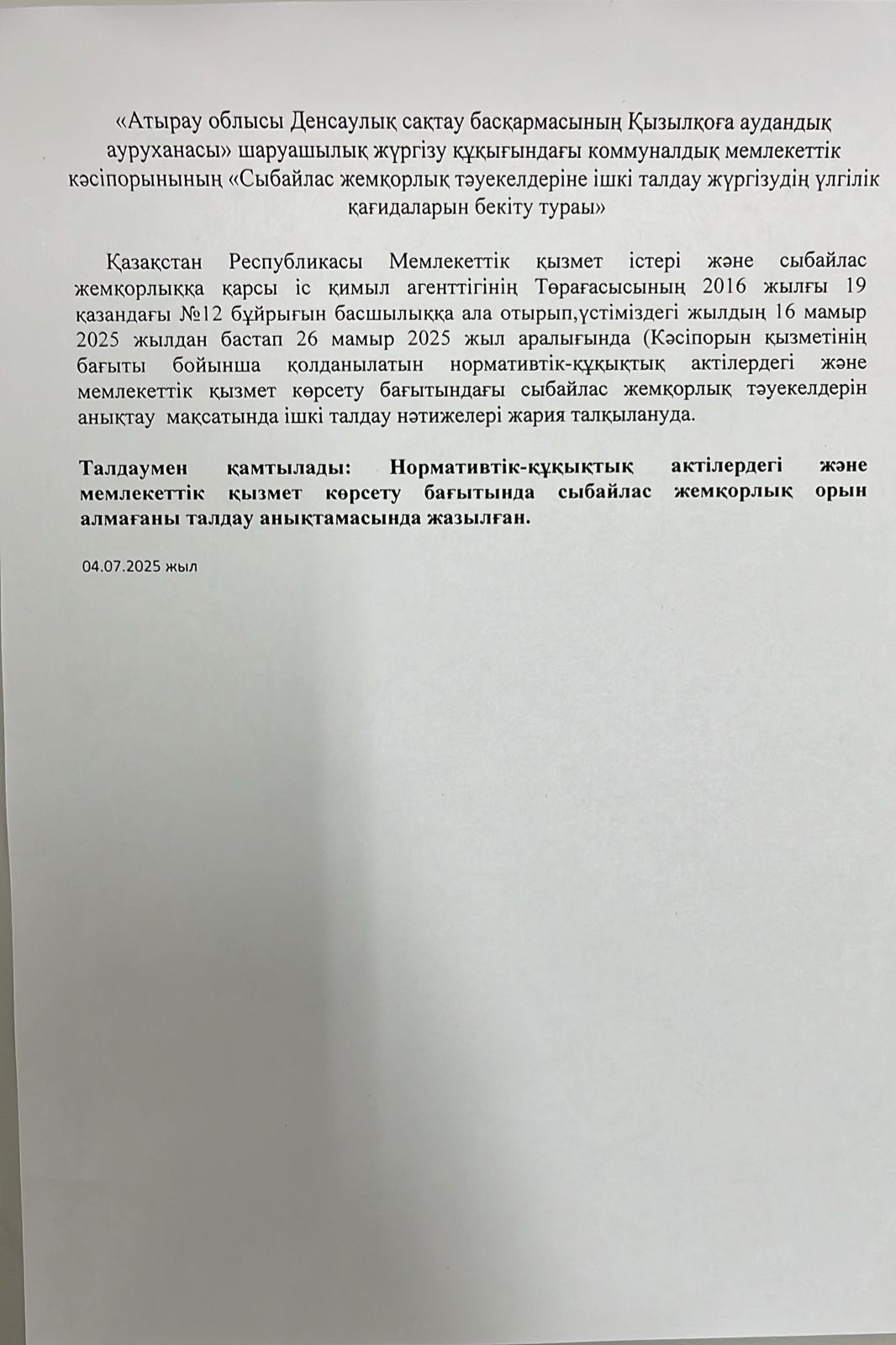 «Қызылқоға аудандық ауруханасы» шаруашылық жүргізу құқығындағы коммуналдық мемлекеттік кәсіпорнының жұмыс тобымен орталықтың құрылымдық бөлімшелерінің қызметіндегі сыбайлас жемқорлық тәуекелдеріне ішкі талдау жүргізілетінін хабарлайды.